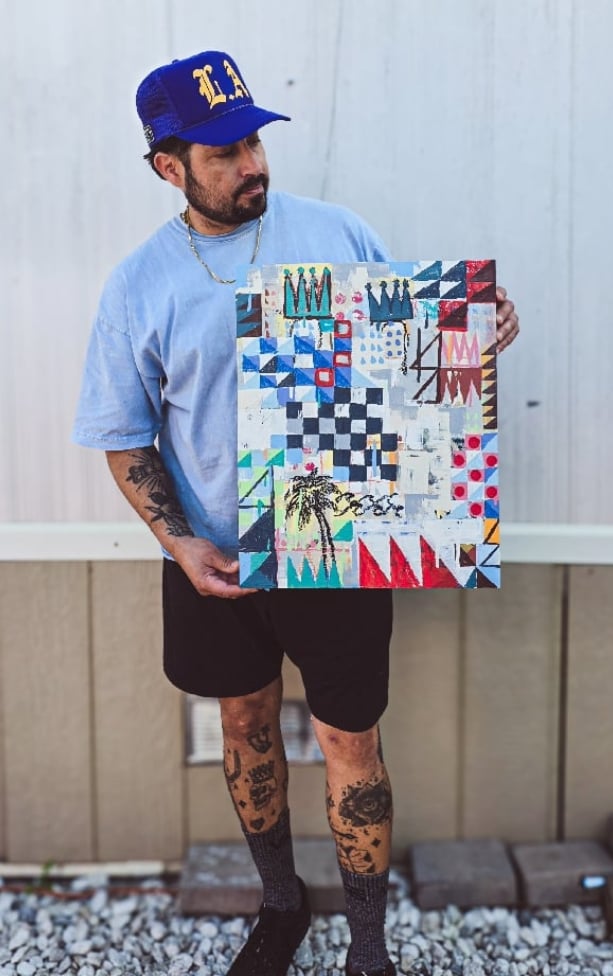 "Urban Oasis" is a vibrant abstract painting that layers checkerboard patterns, crown symbols, and bold geometric shapes in a street art-inspired style. A solitary palm tree emerges through the structured chaos, creating a striking contrast between organic nature and urban geometry.